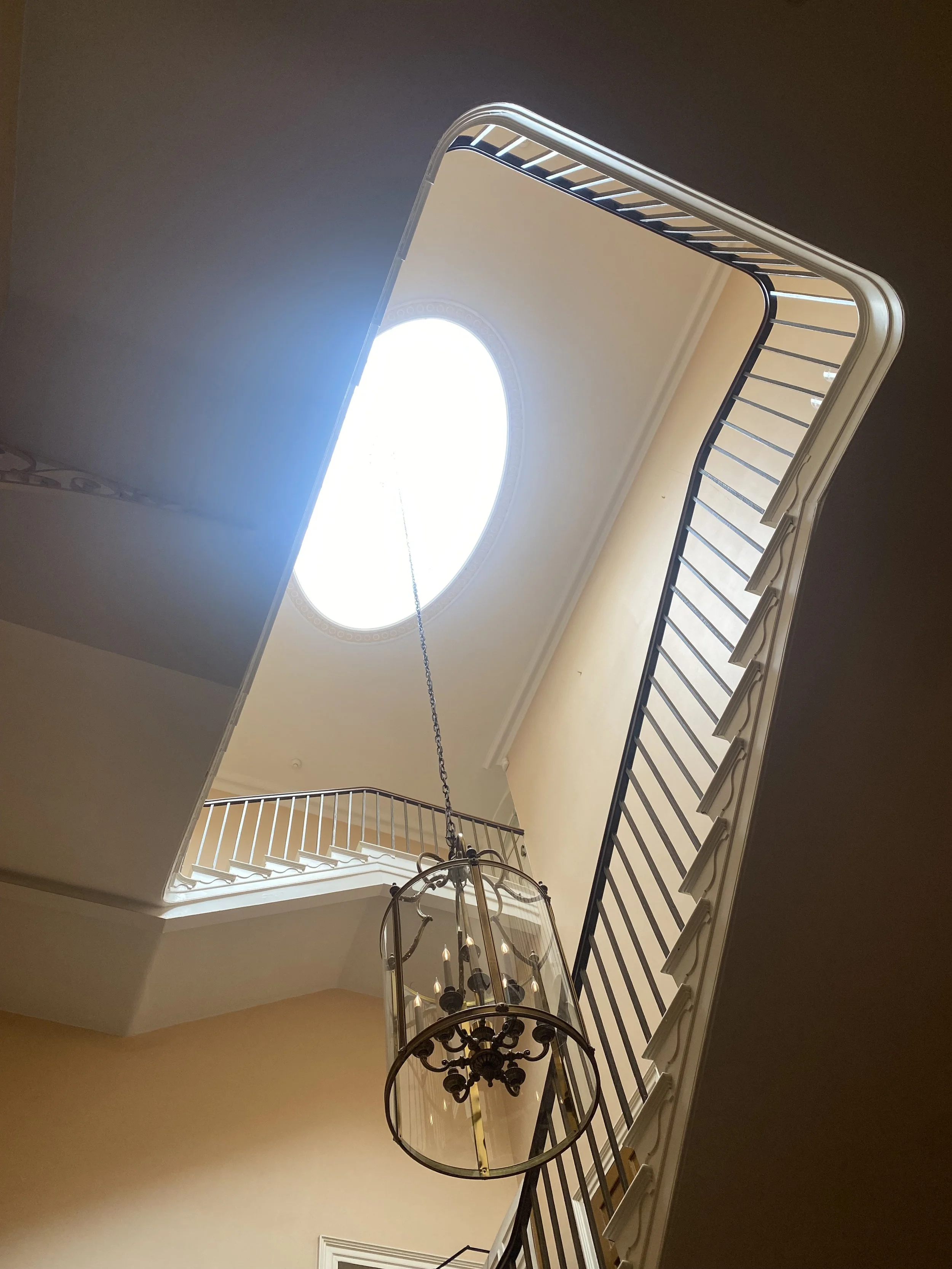 Standing beneath the oval rooflight above the main staircase, I was struck by how clever it is. It’s made entirely of glass framed in fine metal, with the ribs radiating from a central ring where a chandelier was designed to hang. In our projects, we often face restrictions when there’s a rooflight over a staircase or dining table, because it rules out any pendant lighting directly beneath. Here, the design solves that problem beautifully - the chandelier is suspended from the centre of the rooflight itself, allowing both daylight and what would have originally been candlelight to come from the same point. It’s such a clever solution.
