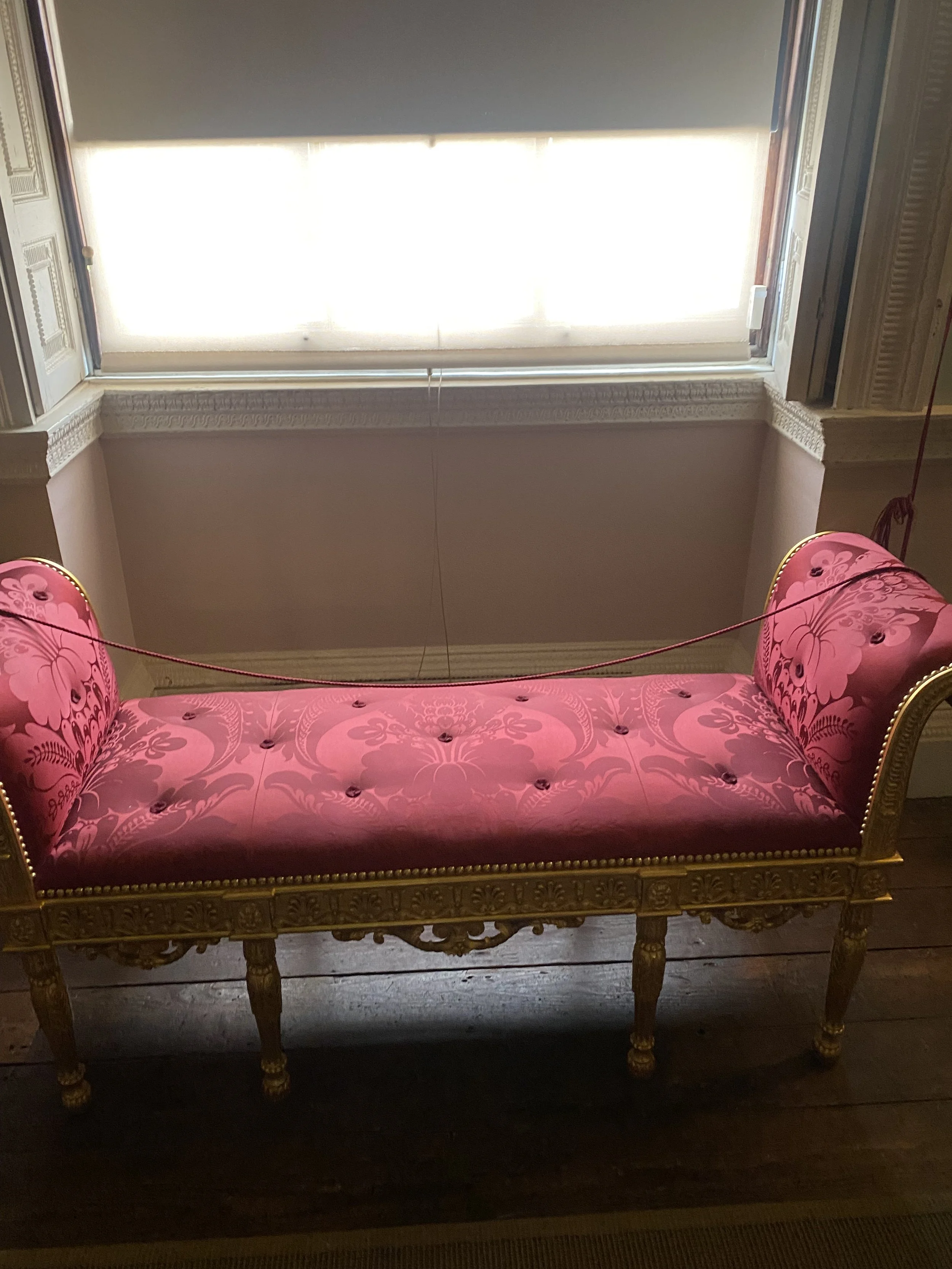 The windows on the ground floor are set deep into the thick walls, which creates these generous reveals where window seats naturally fit. In some rooms they’re built in as part of the panelling, and in others, like here, a freestanding bench has been placed in front of the window. You can imagine how lovely it must once have been to sit here, with the shutters open and light streaming across the patterned upholstery, looking out over the lawns. These spots would have been perfect for reading or quiet conversation, giving a sense of both comfort and connection to the garden outside. Sadly, because of the art collection, the blinds now have to stay closed to protect the paintings from sunlight, so the spaces feel a little dimmer than they would have in the eighteenth century—but the furniture and detailing still tell the story of how these rooms were once enjoyed.