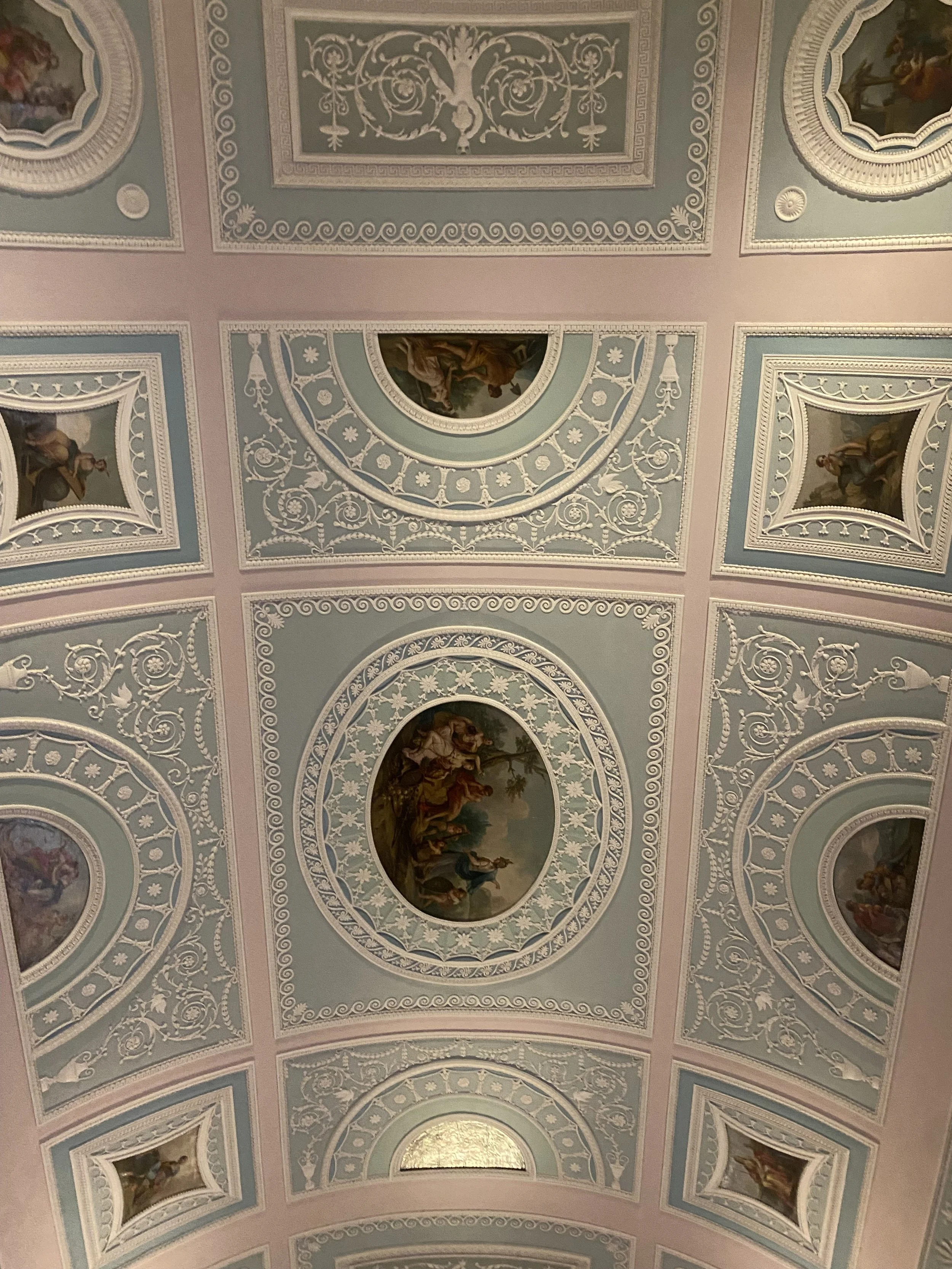 The wrought iron balustrade is particularly fine. The individual uprights are hand-forged, with delicate waterleaf and anthemion patterns that tie the metalwork back to the neoclassical style of the interiors. The light blue paint, which I believe is Adam’s original colour softens the iron and helps it read as part of the room’s decorative scheme rather than something purely functional.
