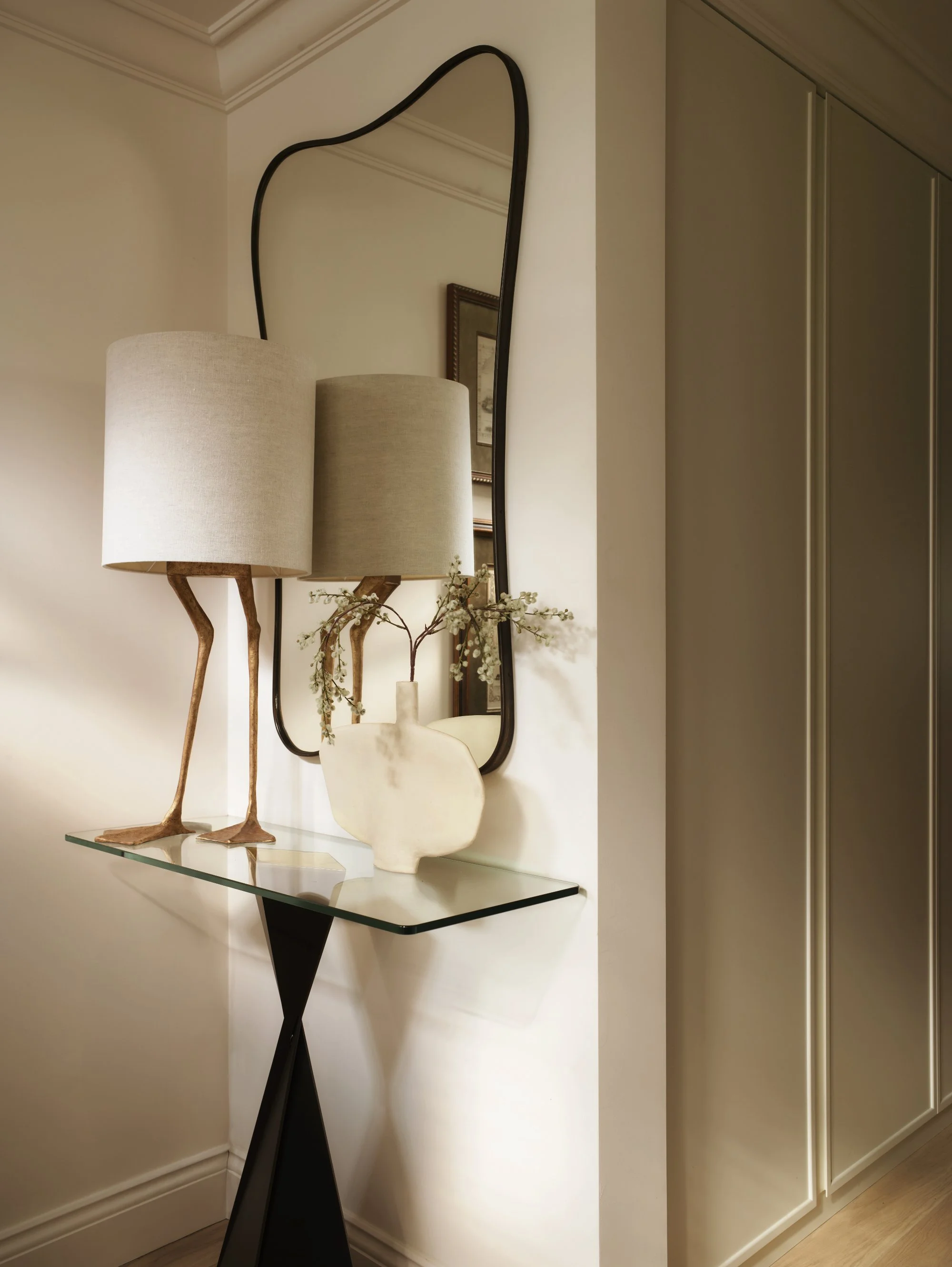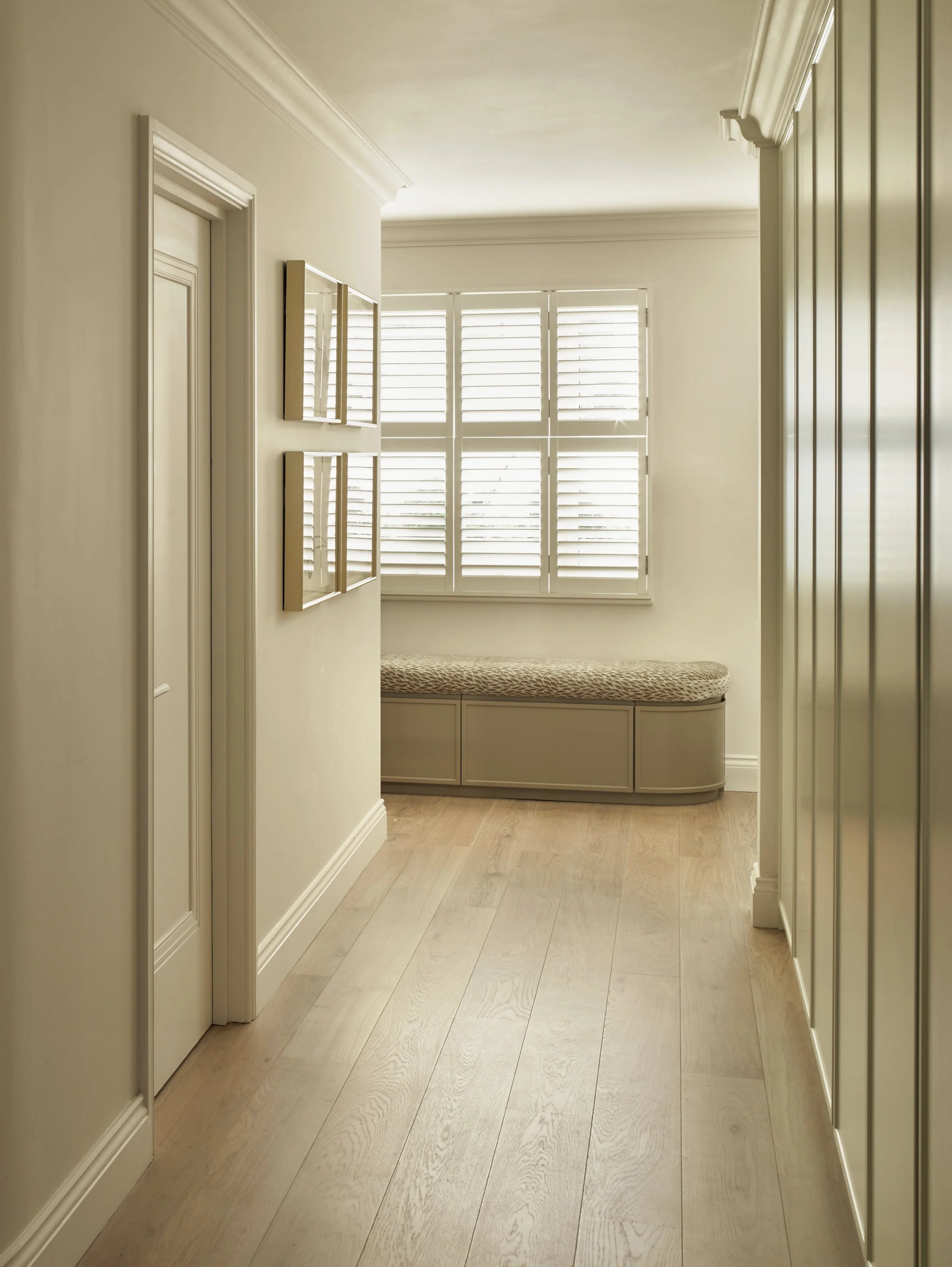 The entrance corridor with a bespoke in-house designed bench with concealed shoe storage