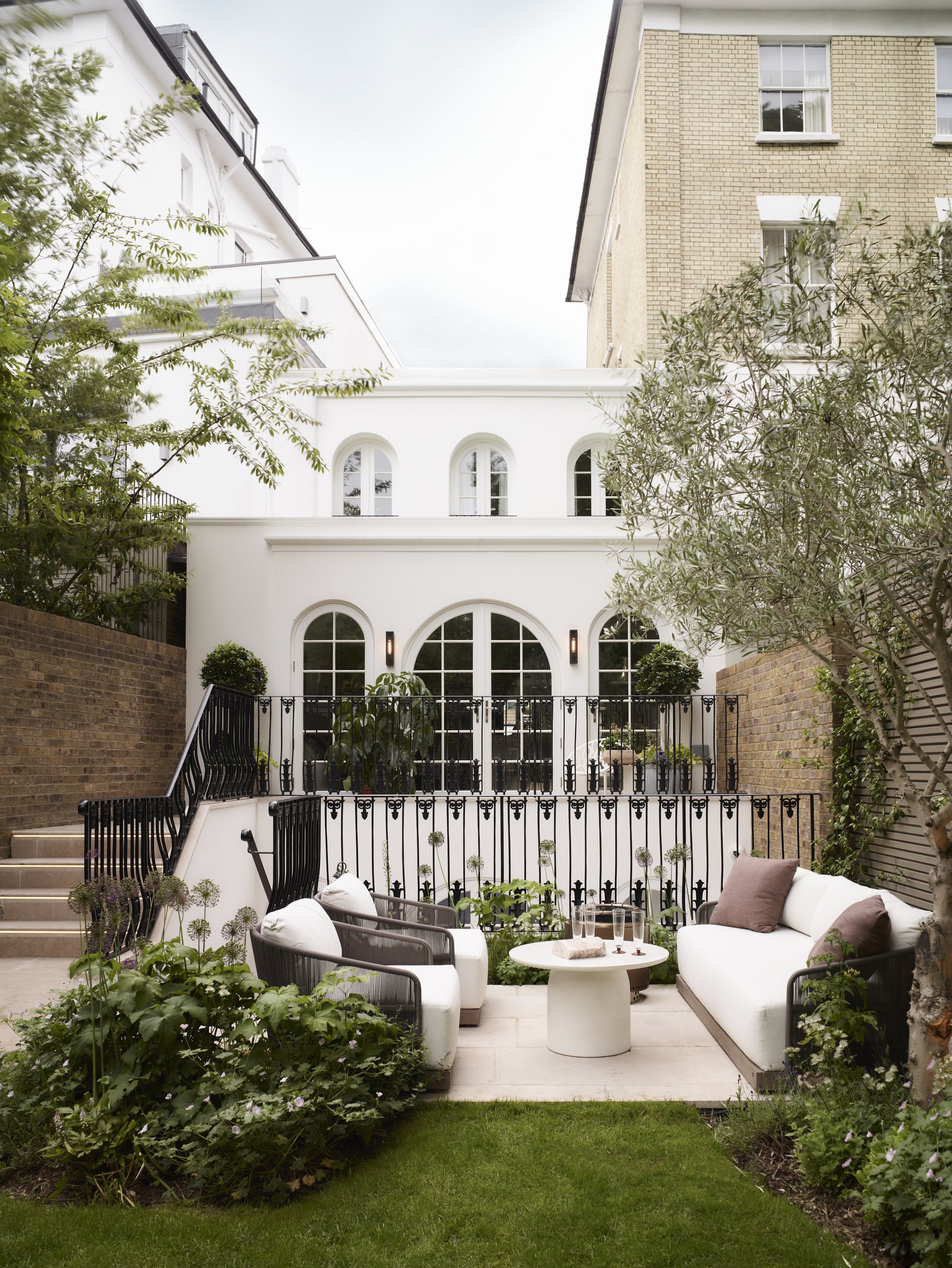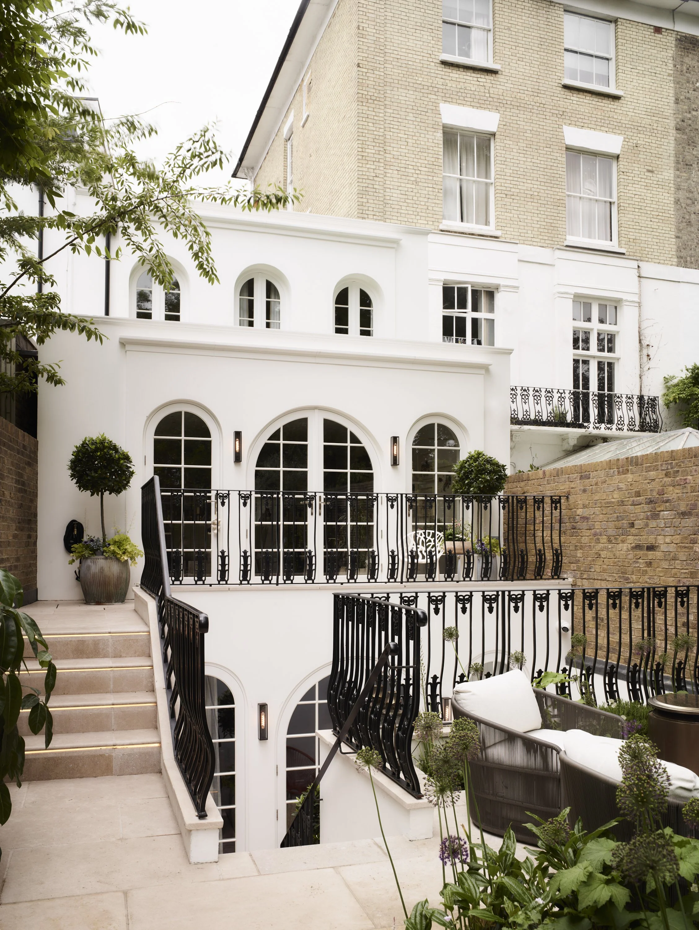 The rear facade of the new build home created with pretty arched doors and windows and traditional black railings