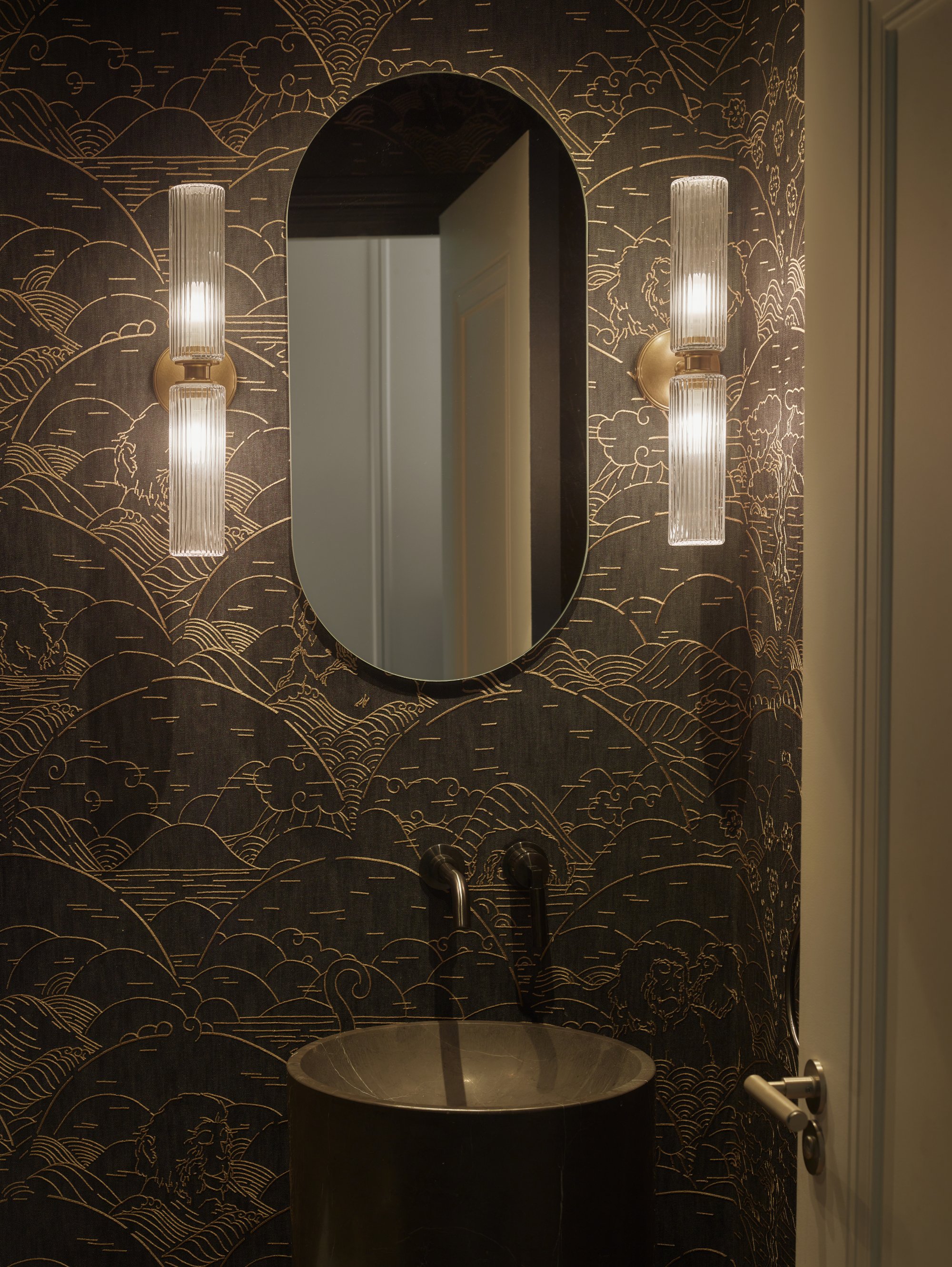 The Powder Room with beautiful Arte wallpaper and a natural stone pedestal basin