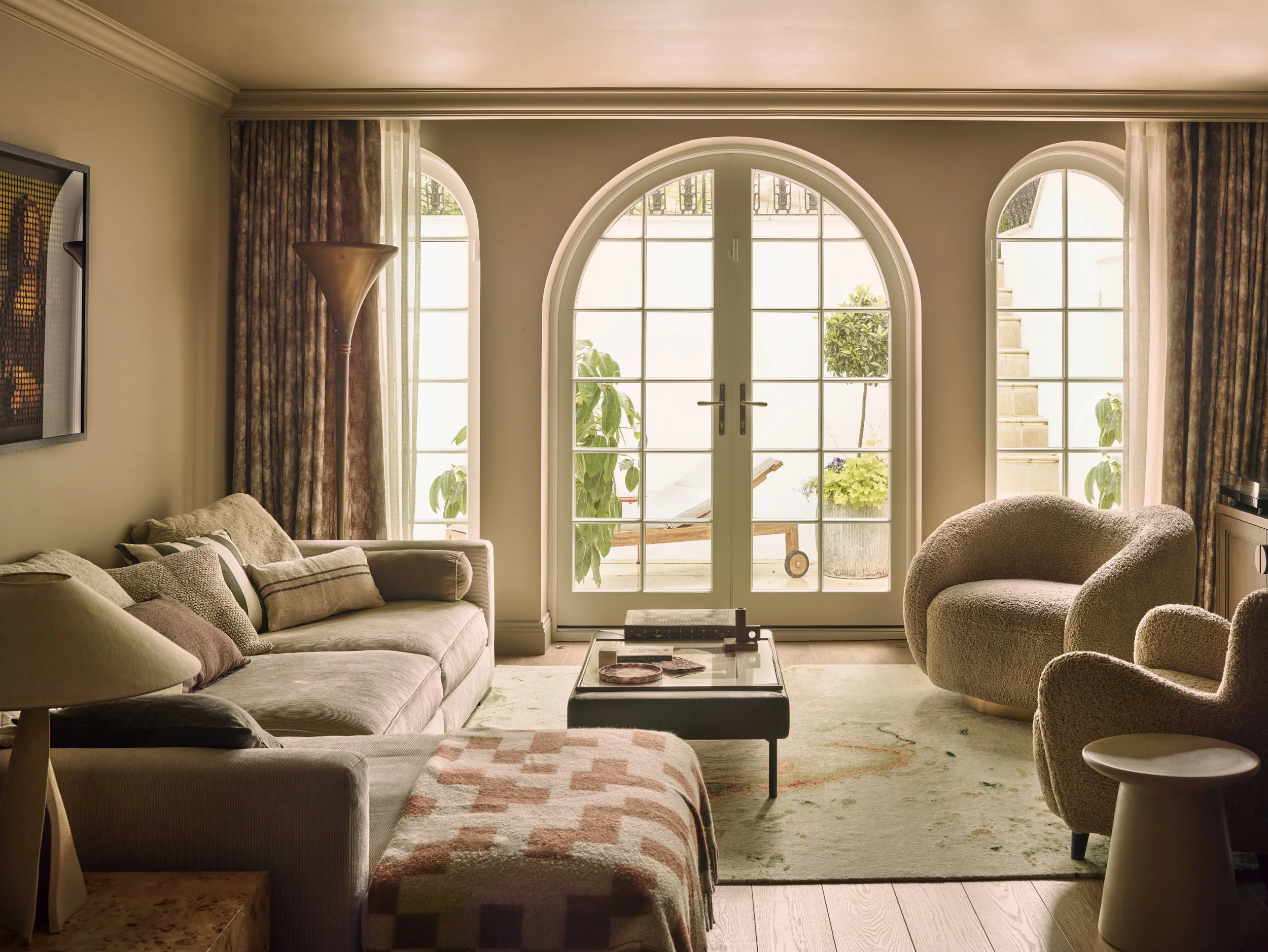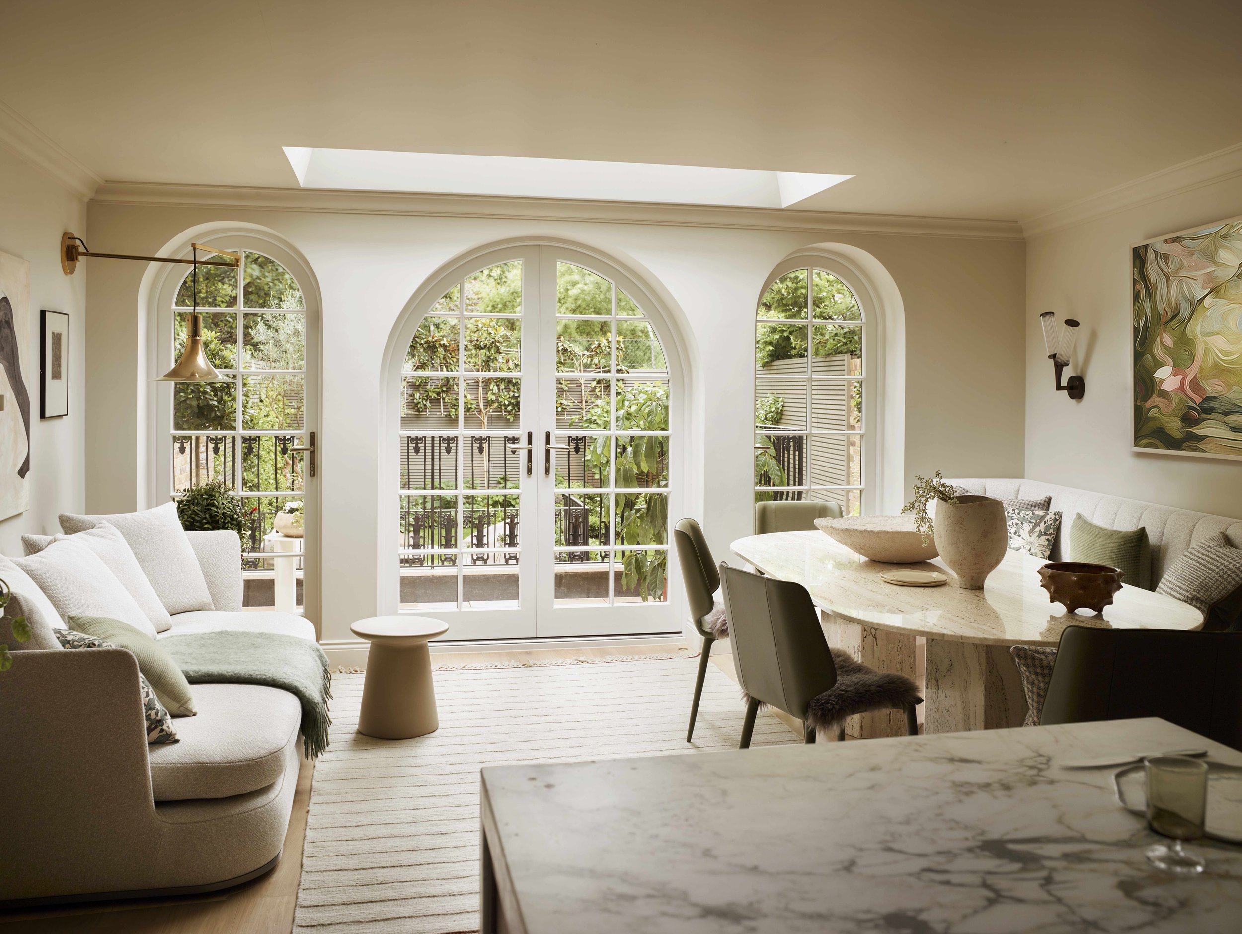 The open plan kitchen, dining and living area that looks onto the garden through the arched windows and doors
