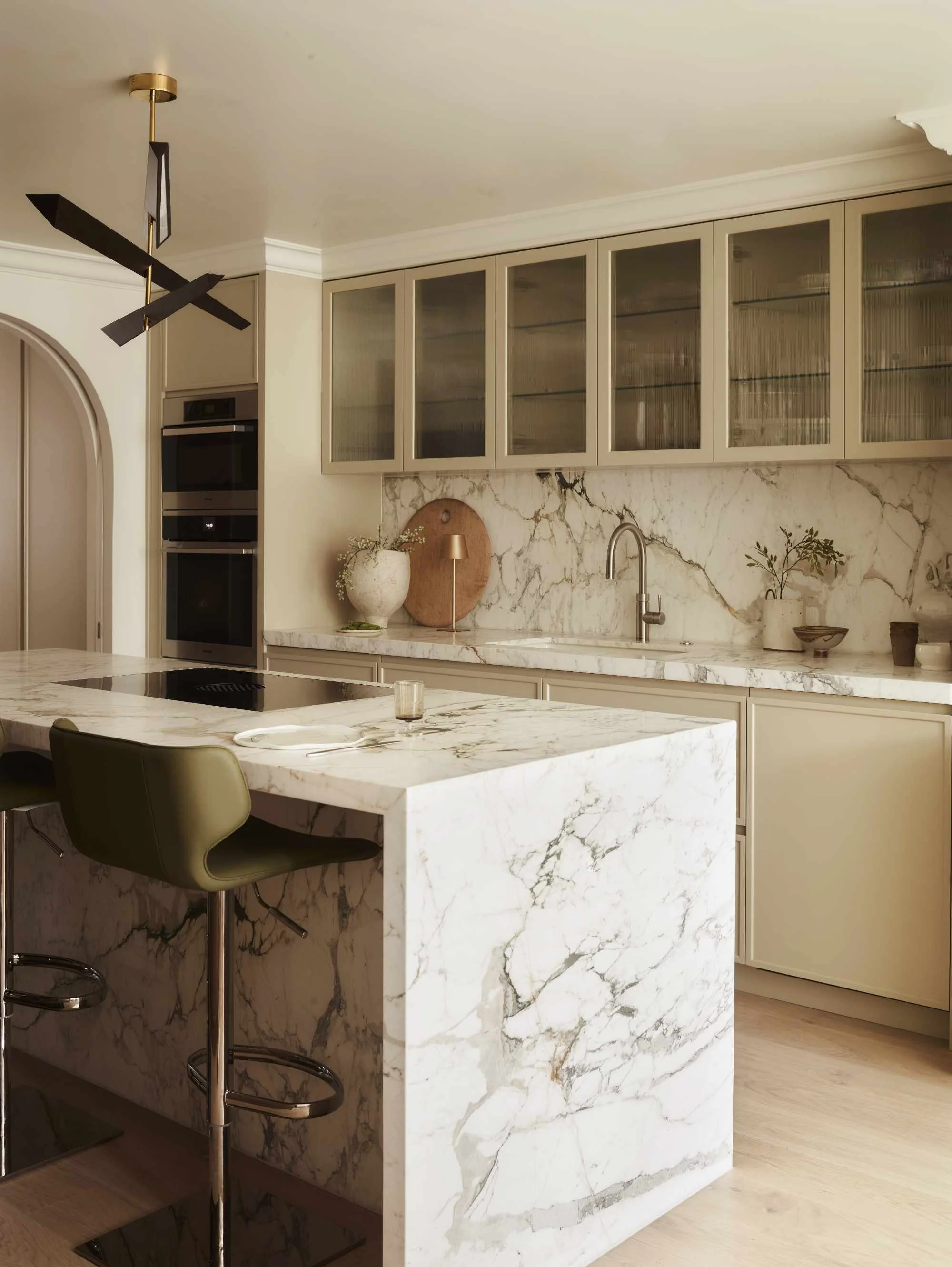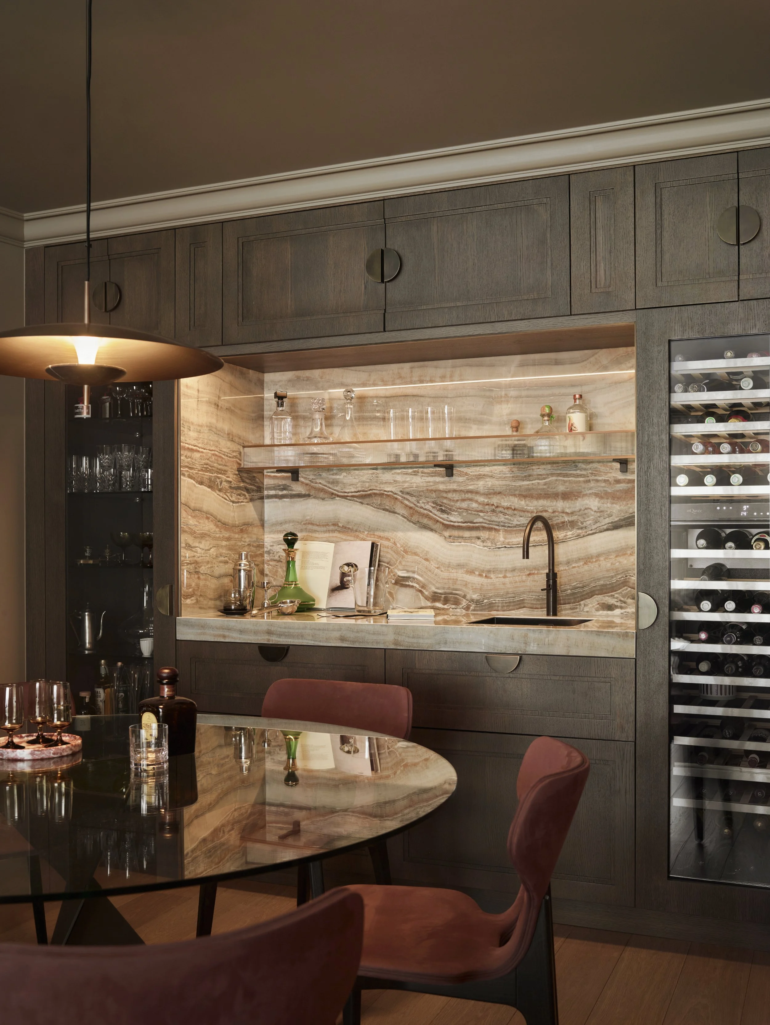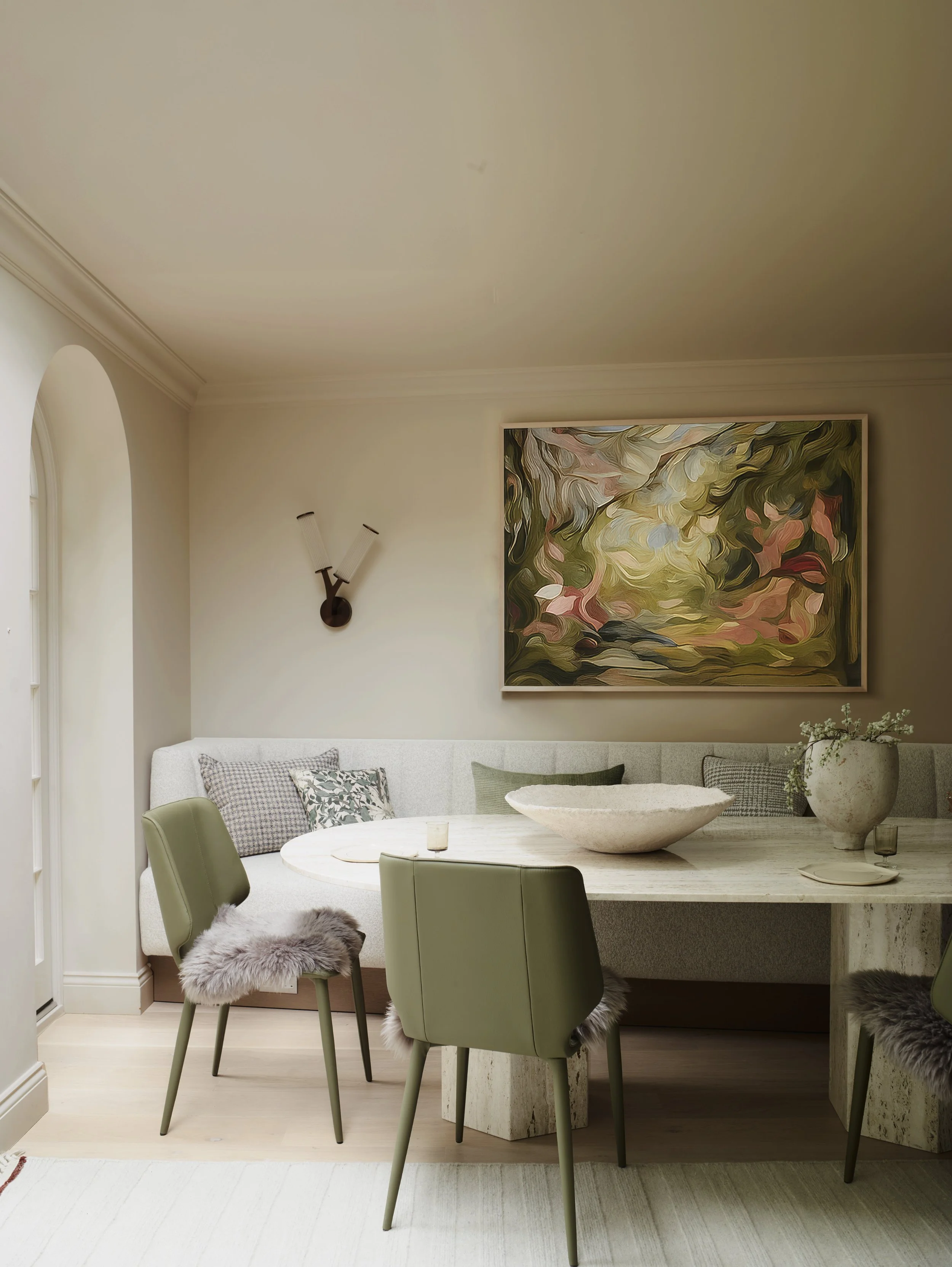 The bespoke banquette was designed in-house to be be softly curved and able to accommodate a big dinner party comfortably